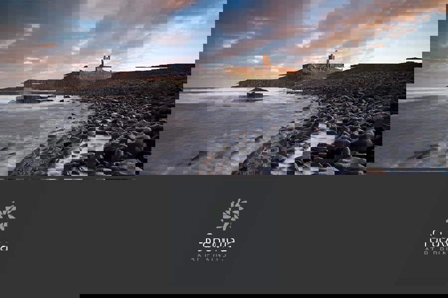 It features a nice warm light catching the tower from the west as the sun begins to descend across the Northumberland landscape. Dunstanburgh Castle is a beautiful location and a favourite place for photographers thanks to the mix of old castle, rocky beach and the enchanting sea. The rocks along the shoreline have been smoothed by the tide over hundreds of years which gives them a glossy dark appearance all along the rugged coastline.