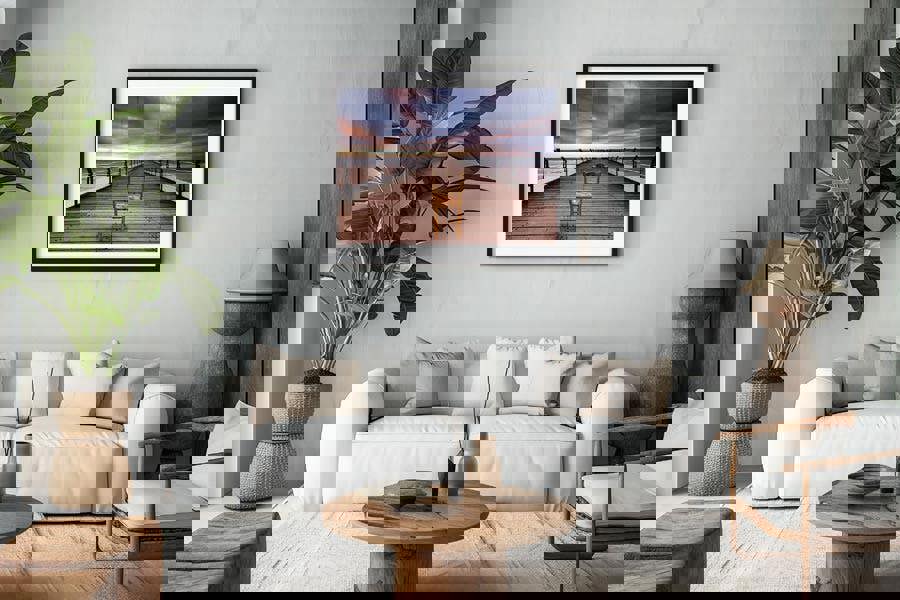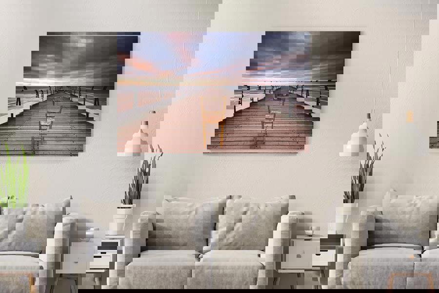 This evocative wall art invites interpretation, drawing the viewer into its quiet mystery. Whether seen as a symbol of solitude, resilience, or a journey into the unknown, East by North East is a powerful statement piece for modern interiors. The linear perspective of the pier guides the eye toward infinity, enhancing the sense of depth and intrigue.