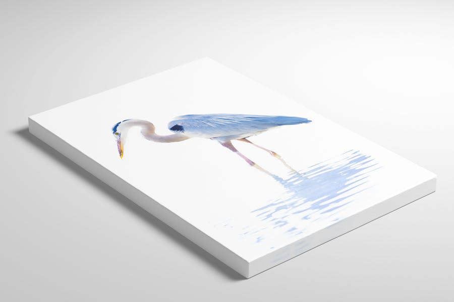 A beautifully poised Great Blue Heron studies the shallows at low tide, its lemon eye and cool-blue plumage set against luminous water. Captured by photographer Jackie Schletter in a clean, high-key style, this wildlife print distils patience, precision and coastal calm.