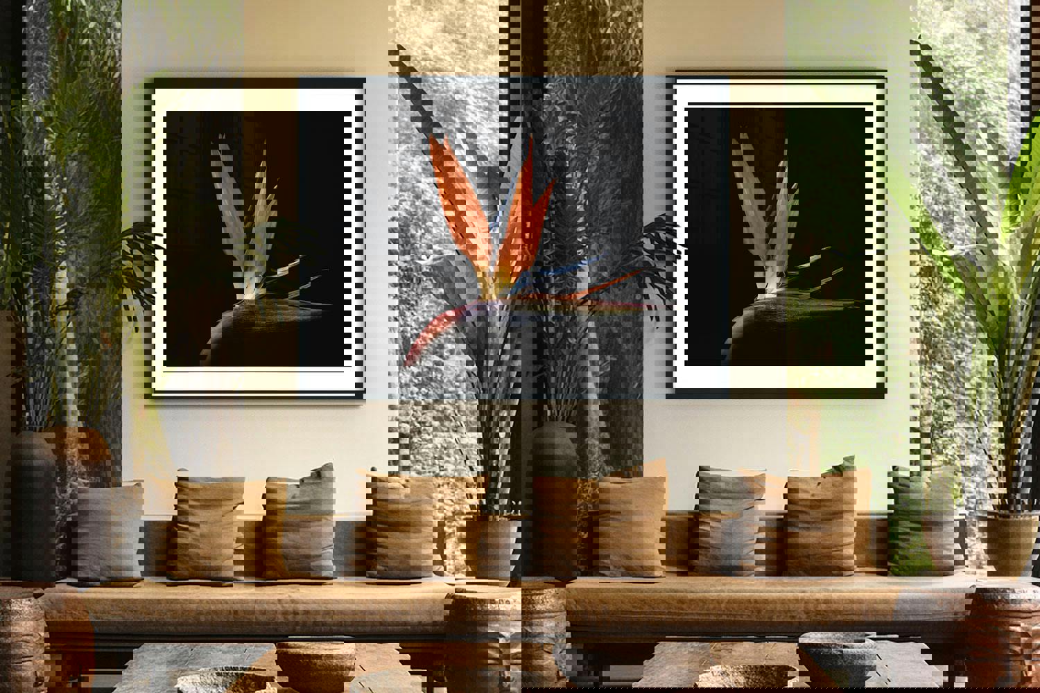 This striking exotic flower print is perfect for modern living rooms, dining areas and creative home offices. The high-contrast palette pops against charcoal or white walls, complements mid-century furniture and brings confident colour to minimalist interiors – a favourite with interior designers and lovers of artistic flower photography.