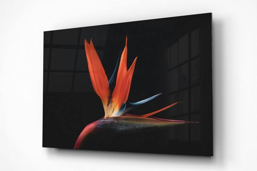 An elegant photographic study of the beautiful Bird of Paradise flower, its sculptural petals lit like molten glass against a deep black backdrop – available as a made to order botanical wall art piece.