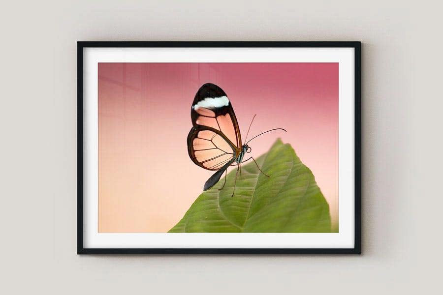 Introduce a touch of ethereal beauty to your home with "Glasswing Butterfly. " This exquisite art print captures the delicate elegance of a glasswing butterfly poised gracefully on a vibrant green leaf. The transparent wings, bathed in soft pastel hues, create a captivating and dreamy atmosphere, making it an ideal addition to any room in your home.