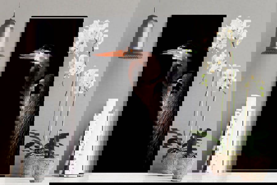 Your heron artwork is produced to order by a professional fine-art team. Choose a museum-grade framed photographic print with mount for classic sophistication, a gallery-wrapped canvas that adds gentle texture, or an edge-to-edge acrylic panel that heightens contrast. Sizes range from modest accent to wall-spanning centrepiece – if you’d like an even larger heron print, just ask for a bespoke edition.