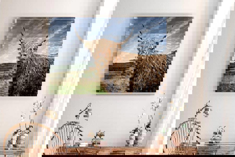 If you're looking for a little Highland attitude to spice up your walls meet the 'Guardian of the Glen' – part cow, part rockstar, and 100% majestic.