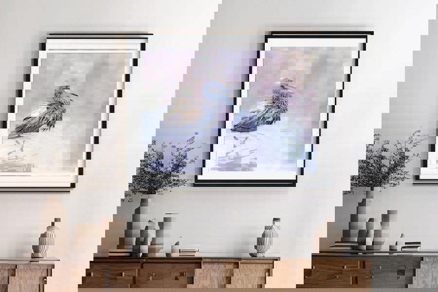 Display your heron print away from prolonged direct sunlight, high moisture and strong heat; dust lightly with a soft, dry cloth to keep those pastel feathers looking pristine.