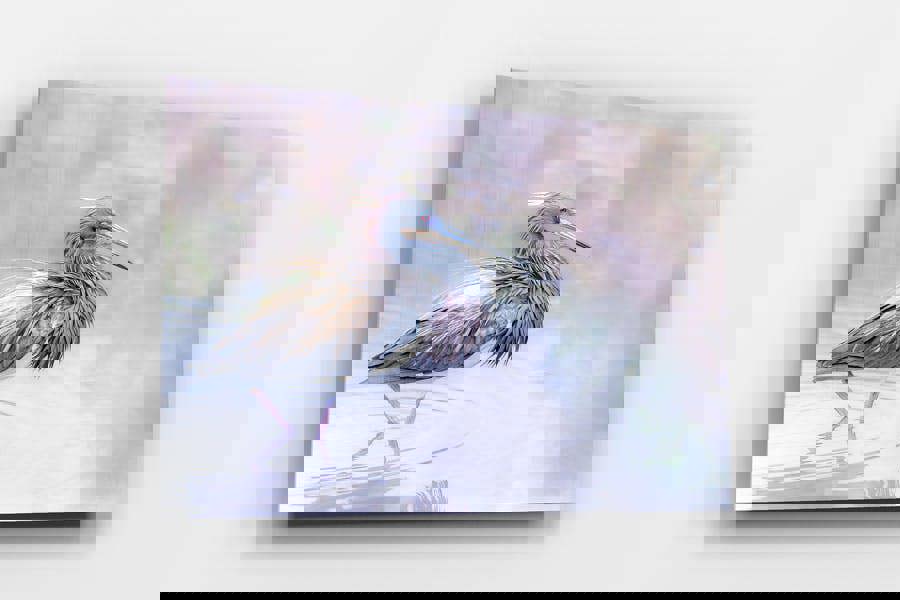 A Tri-colored Heron pauses mid-stride in a shallow Florida pond, its plumage flushed in soft lilacs, creams and steel blues that appear only during breeding season. Jackie Schletter captured the bird just as a gentle haze turned water and reeds into a muted wash, allowing the heron’s ruby eye and delicate feather fringing to take centre stage in this made to order wall print.