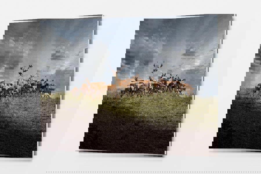 Capture the raw beauty of nature with this stunning wildlife wall print featuring a group of Highland deer standing proudly under dramatic skies. Red deer, one of the UK's largest land mammals, are known for their impressive antlers, which can span up to a metre wide and are shed and regrown each year. This powerful scene brings the untamed wilderness into your home, making this deer wall art perfect for homeowners and interior designers looking to create a striking focal point in any room.