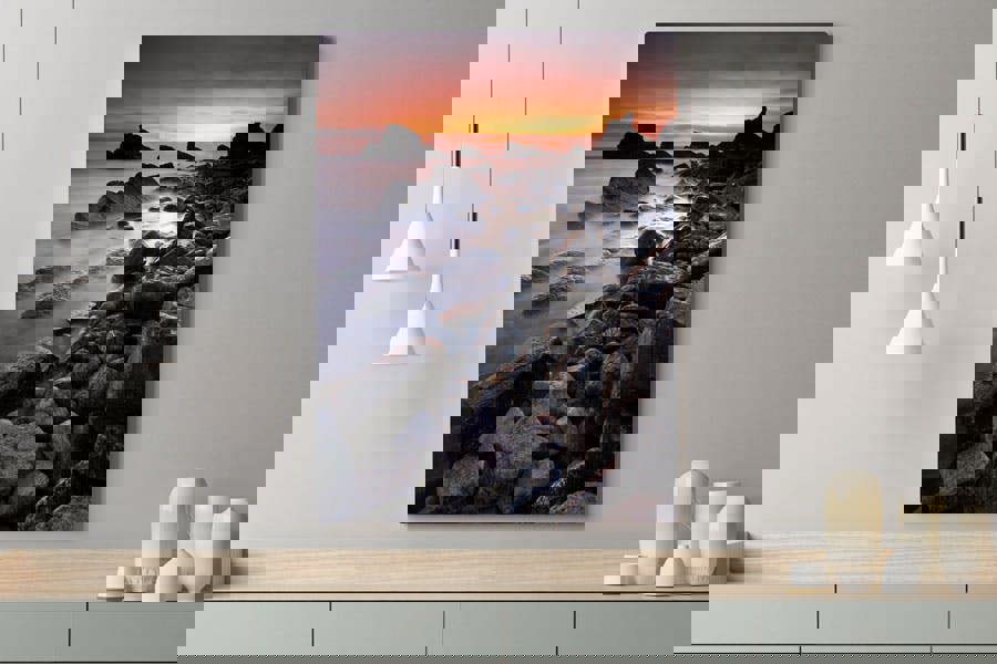 Capture the wild beauty of Dorset’s Jurassic Coast with this striking seascape print, featuring the rugged Mupe Rocks extending into the sea beneath a fiery sunset. The textured rock formations contrast beautifully with the misty, ethereal water – an effect created through a long exposure, adding a dreamlike quality to this dramatic coastal scene.