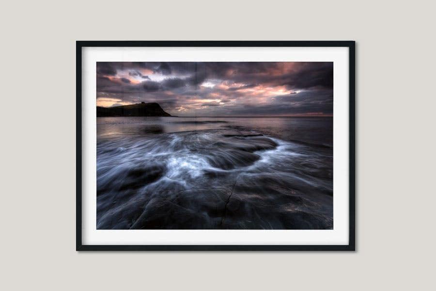 Immerse yourself in the raw power of nature with this striking seascape of Kimmeridge Bay in Dorset. The moody sky looms over the restless sea, while the long exposure captures the swirling motion of the tide as it washes over the rugged rock formations. Dark, atmospheric tones create an intense yet captivating scene, making this ocean artwork a standout piece.