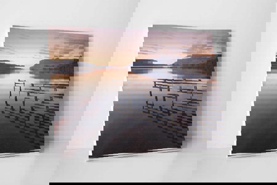 This wall print of Derwentwater in the Lake District is a beautiful example of how the lake can be silky smooth in the quiet of an evening just before the sun goes down. It’s a really tranquil photograph that conveys a lovely sense of calmness and balance. Showing Skiddaw from one of the many ferry landings, this framed print offers a classic view of Derwent and works equally well as a canvas print or on acrylic mount.