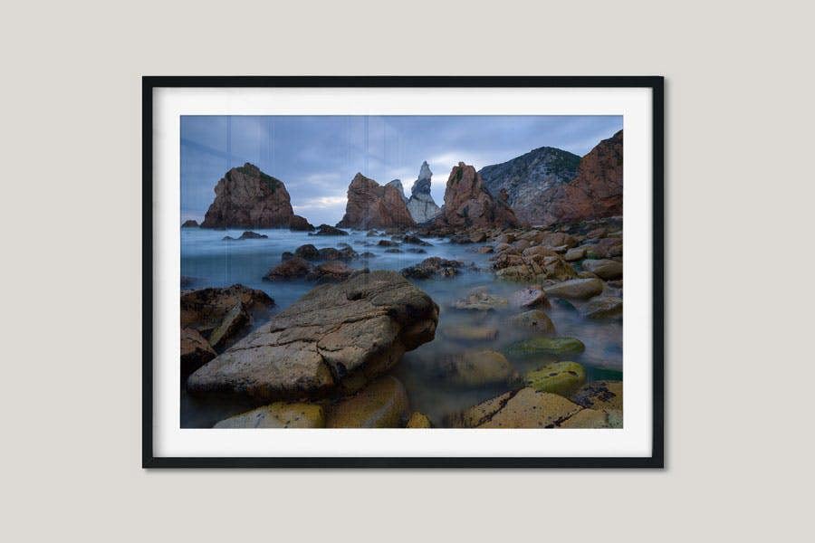 Hidden away along the rugged cliffs of Sintra-Cascais Natural Park, Portugal, this breathtaking seascape captures the raw beauty of an untouched shoreline. The dramatic rock formations rise from the misty waters, shaped by centuries of relentless waves, while the muted twilight tones add an air of mystery. A place few dare to venture, this secluded beach offers a moment of solitude and awe, making it a captivating statement piece for any space.