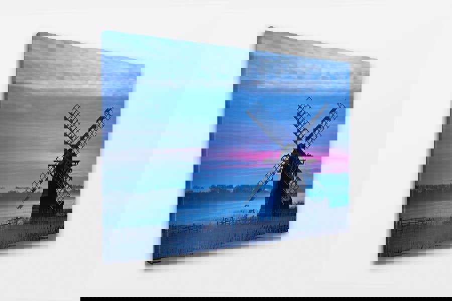 Capture the quiet beauty of an early morning in Suffolk with this stunning fine art print of Herringfleet Mill. Shrouded in soft, low-lying mist, the historic windmill stands against a breathtaking sky infused with gentle hues of blue and pink. The tranquil atmosphere and subtle dawn light create a captivating sense of stillness, making this artwork a timeless addition to any space.