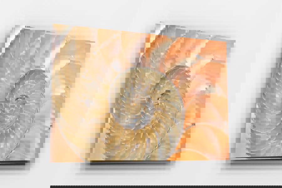 Captured in high resolution, the intricate spirals of the Nautilus shell follow the Fibonacci sequence, a naturally occurring mathematical ratio found throughout nature and revered in art and design. This striking shell artwork brings together science, art, and beauty in a way that is both calming and intellectually fascinating.
