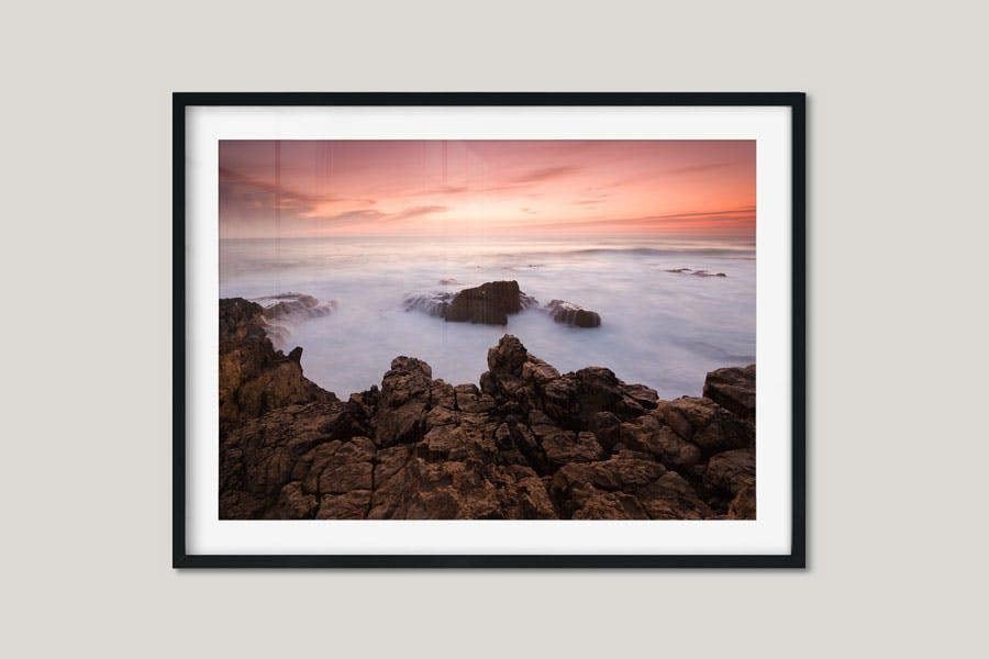 As the last light of the day fades, the Atlantic Ocean takes on a dreamlike quality in this breathtaking seascape from Sintra-Cascais Natural Park, Portugal. Captured using a long-exposure technique, the waves appear soft and mist-like as they weave around the jagged rocks, creating a mesmerising contrast between motion and stillness. The warm hues of the sunset blend seamlessly into the deepening blues of twilight, making this an evocative piece that brings serenity and depth to any space.