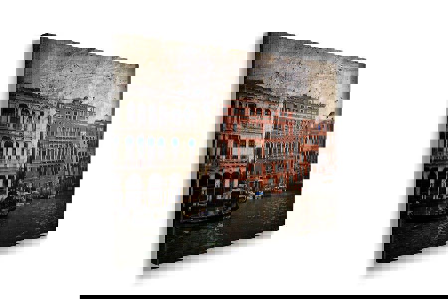 Immerse yourself in the romantic charm of Venice with this striking wall art print, capturing a classic view of the Grand Canal. The elegant Venetian facades, adorned with intricate Gothic and Renaissance details, stand proudly along the water’s edge, their weathered beauty enhanced by a carefully applied textured effect. This artistic touch lends a timeless quality to the image, evoking the rich history and enduring allure of this floating city.