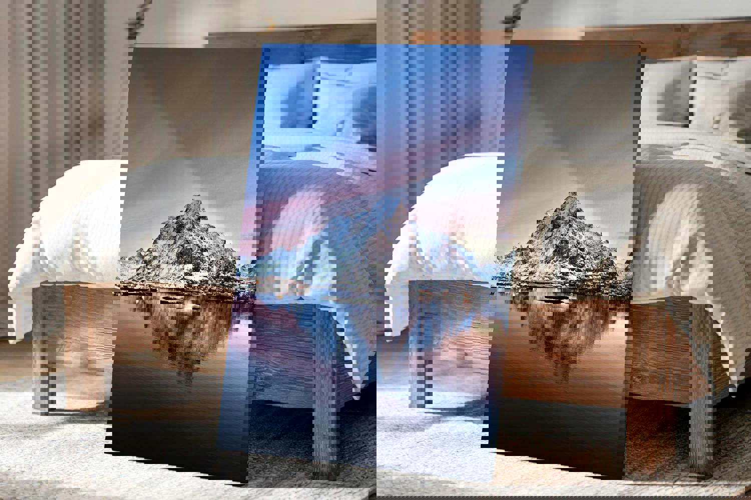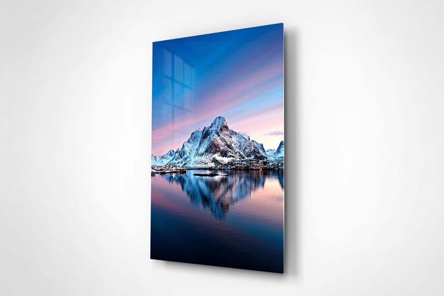 This landscape artwork is suited to interiors where a vertical composition can introduce height and structure. It works effectively in living rooms, bedrooms, hallways or offices where the upward movement of the mountain and its reflection can guide the eye through the space. The combination of cool blues and warmer highlights allows it to integrate with neutral colour schemes, natural materials or contemporary interiors with clean lines.