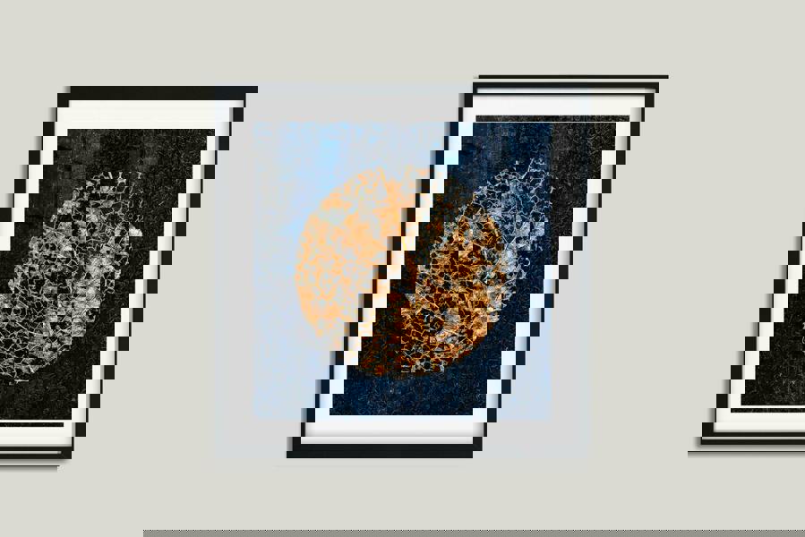 A single decaying leaf becomes a work of art in this striking abstract wall print by Doug Chinnery. Its intricate network of veins, glowing in gold against a textured indigo background, reveals the quiet beauty of nature’s design – fragile yet enduring. Organic Form transforms natural decay into a celebration of structure, colour and form.