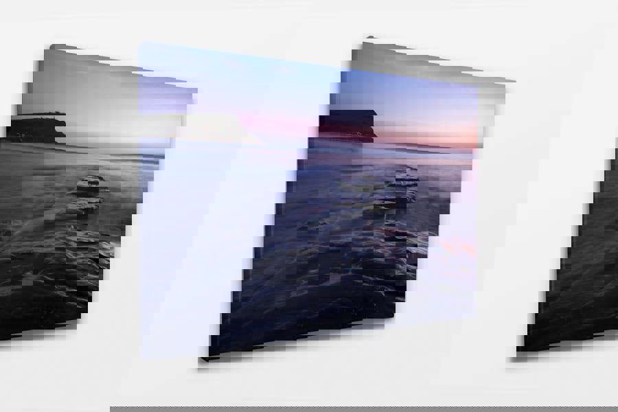 Experience the quiet beauty of Kimmeridge Bay in Dorset with this breathtaking seascape. As the first light of day graces the Jurassic Coastline, soft pastel hues blend seamlessly into the sky, casting a gentle glow over the rippling waters. The smooth, time-worn rock formations stretch toward the ocean horizon, creating a natural pathway that invites the viewer into the scene. The long exposure technique enhances the ethereal quality of the water, adding to the peaceful and meditative mood.