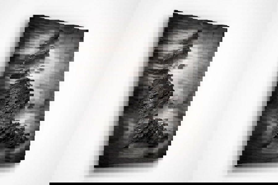 Capture the timeless beauty and rugged elegance of the British coastline with the "Peverill Point" black art print by acclaimed photographer Doug Chinnery. This stunning black and white seascape showcases the dramatic rock formations of Peverill Point in Dorset, enveloped by the misty embrace of the sea, creating a mesmerising contrast between the sharp textures of the rocks and the smooth, ethereal waters.