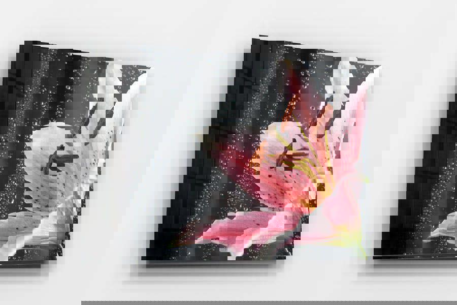 This exquisite botanical art print captures the delicate beauty of a pink lily, its petals unfolding against a moody, dark background. The intricate details and soft lighting create a stunning contrast, highlighting the flower’s vibrant hues and graceful form. Tiny droplets of water add a refreshing touch, enhancing the sense of freshness and purity.