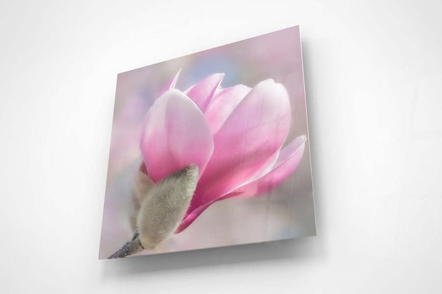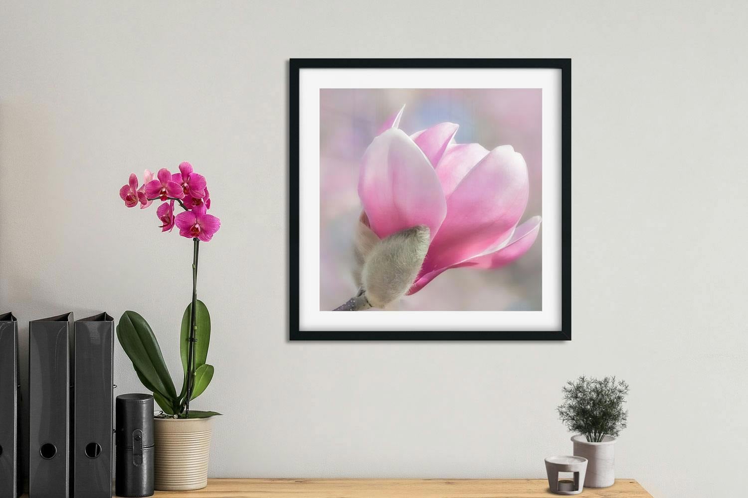 Silky petals unfurl from a downy bud, their translucent pinks catching the light while the background melts into gentle pastels. The close viewpoint and shallow depth of field emphasise the flower’s sculptural curves, creating a piece of artistic flower photography that feels calm and uplifting. What we like most about this art print is the interplay of textures – the velvet bud against the smooth, light-washed petals – which adds real tactility to the image.