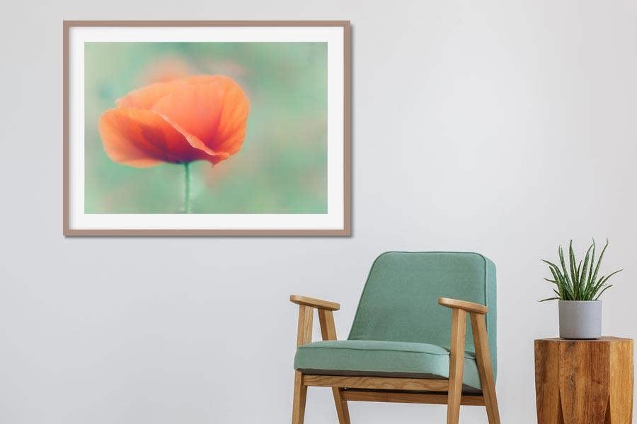 Your poppy artwork is produced to order by skilled printers. Choose a fine-art framed photograph with mount, a hand-stretched flower print canvas for painterly texture, or an ultra-clear acrylic panel that makes the colour sing. Sizes range from small accent to room-anchoring centrepiece – let us know if you’d like a larger poppy print.