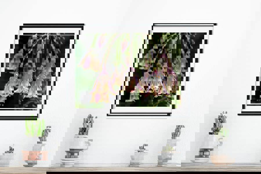 Floral art print 'Rain Bells' presents a mesmerising close-up of Allium bulgaricum, each bell-shaped bloom beaded with crystal raindrops that enlarge its gentle greens, purples and creams. Shot by award-winning photographer Jacky Parker, the artwork celebrates the quiet drama of nature’s details, bringing instant serenity to any room.
