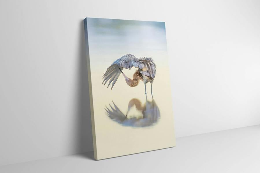Bathed in the soft light of early morning, a reddish egret pauses in quiet grace, reflected perfectly in the still water beneath. Every delicate feather catches the dawn glow, creating a moment of pure balance between elegance and movement. Reddish Egret at Dawn is a captivating wildlife wall print that celebrates nature’s beauty at its calmest hour.