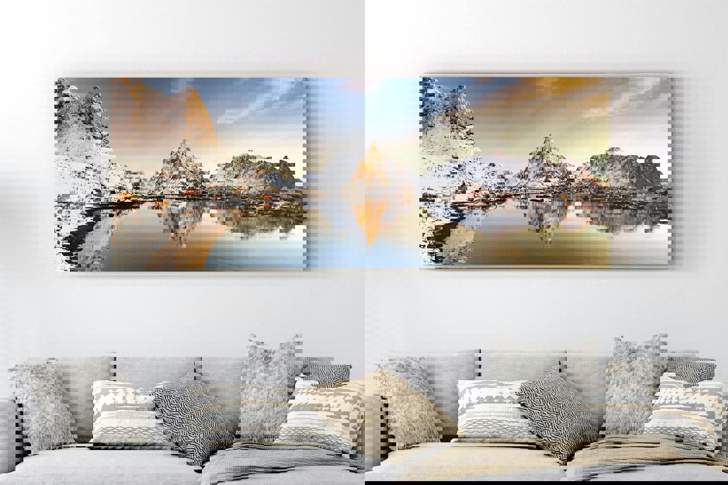 This striking Nordic landscape makes a captivating feature in living rooms, dining areas or bedrooms. Its cool, reflective palette complements modern and minimalist interiors, while its panoramic format brings a sense of openness and calm. Perfect for admirers of Scandinavian scenery, fine art photography and dramatic mountain vistas.
