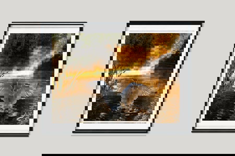 Captured on a misty morning along the River Avon, this breathtaking wildlife print features a graceful swan in a moment of quiet elegance. As the early sunlight filters through the mist, the swan stretches its wings in a timeless display of beauty and serenity. The soft glow of dawn enhances the ethereal atmosphere, making this piece a stunning addition to any interior.
