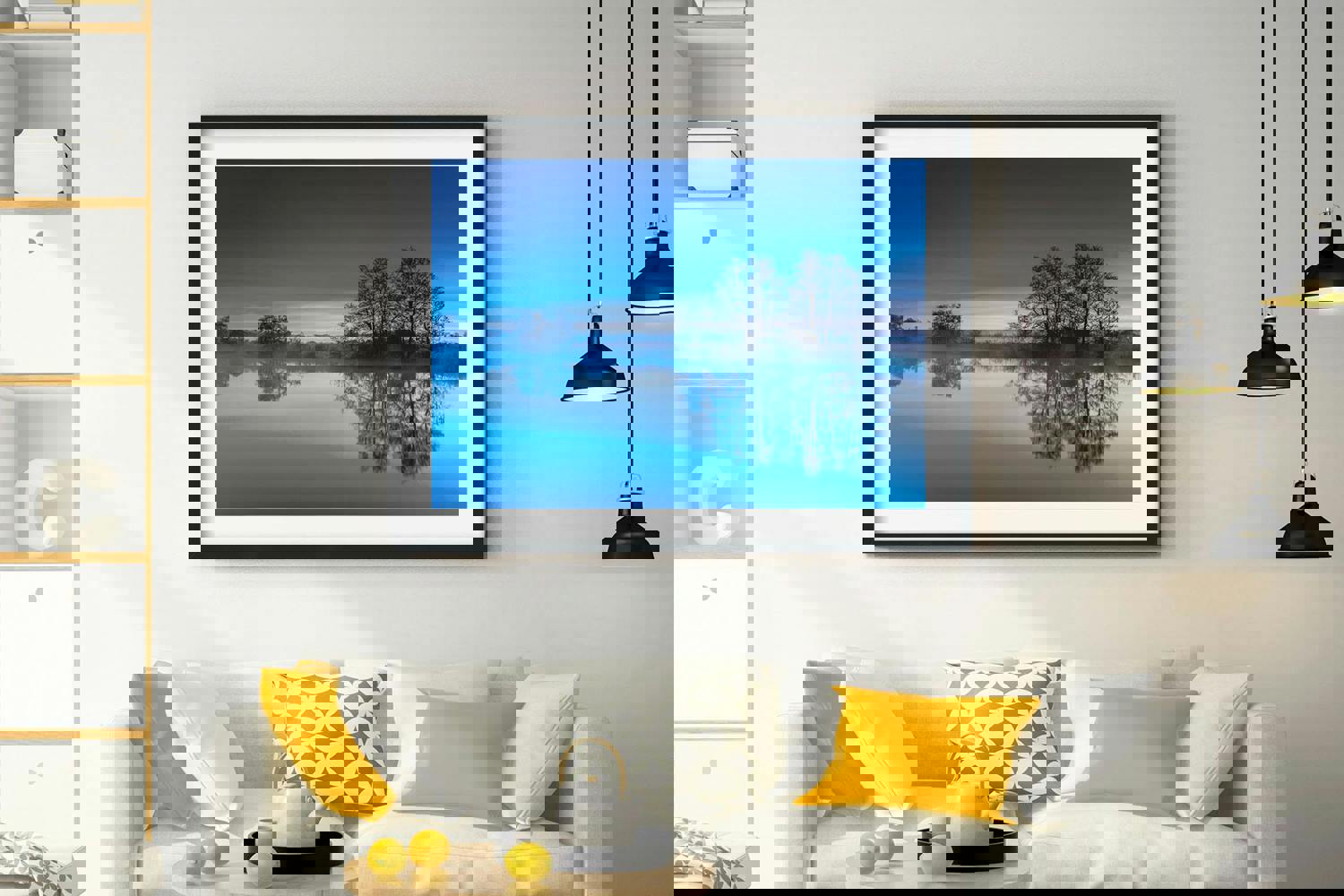This peaceful landscape print brings serenity and balance to living rooms, bedrooms or workspaces. Its cool blue palette and reflective composition suit both modern and classic interiors, adding a calming focal point to any room inspired by nature or minimal design.