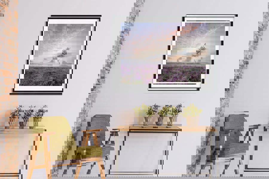 Immerse yourself in the quiet beauty of Serenity at Sunrise, a captivating fine art print that showcases the ethereal charm of Westleton Heath in Suffolk. This stunning photograph captures a misty autumn morning as the heathland awakens beneath a soft sunrise. The vibrant purple hues of blooming heather stretch across the landscape, creating a dreamy contrast against the gentle mist and pastel skies. A lone tree stands gracefully amidst the scene, adding a focal point of natural elegance.