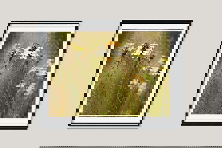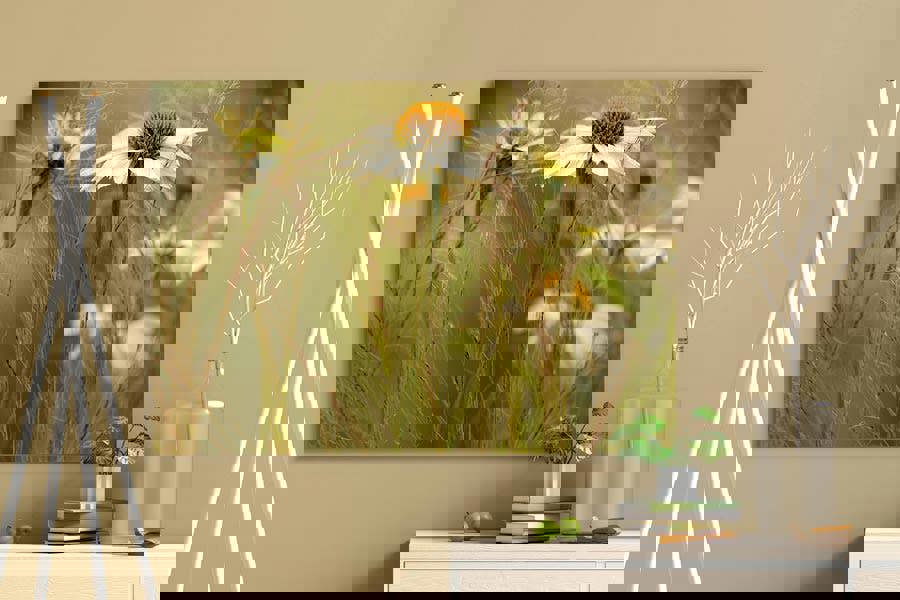 Floral wall art print Soft Shades of Summer captures the dreamy ease of a high-summer meadow: golden Rudbeckia coneflowers drifting among silvery plumes of Stipa grass, all bathed in mellow afternoon light. The sun-kissed petals and feathery textures evoke a gentle breeze and instant calm, making this piece an eye-catching centre-piece for any space.