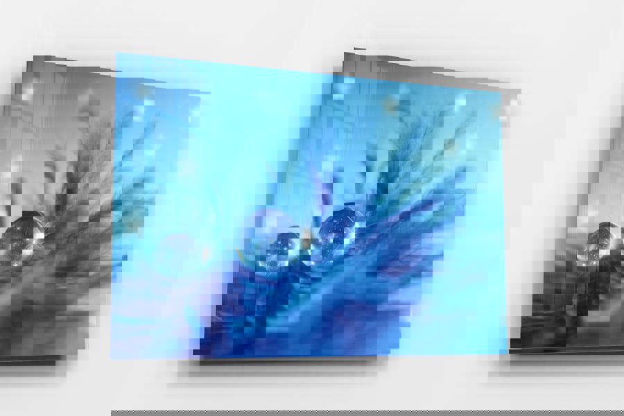 Transform your living space with the enchanting allure of "Star Drops. " This mesmerising macro art print captures the delicate beauty of dew drops resting on soft feathers, with tiny stars twinkling within the droplets. The serene blue tones and ethereal quality of the composition create a dreamy and calming atmosphere, perfect for adding a touch of magic to any room in your home.