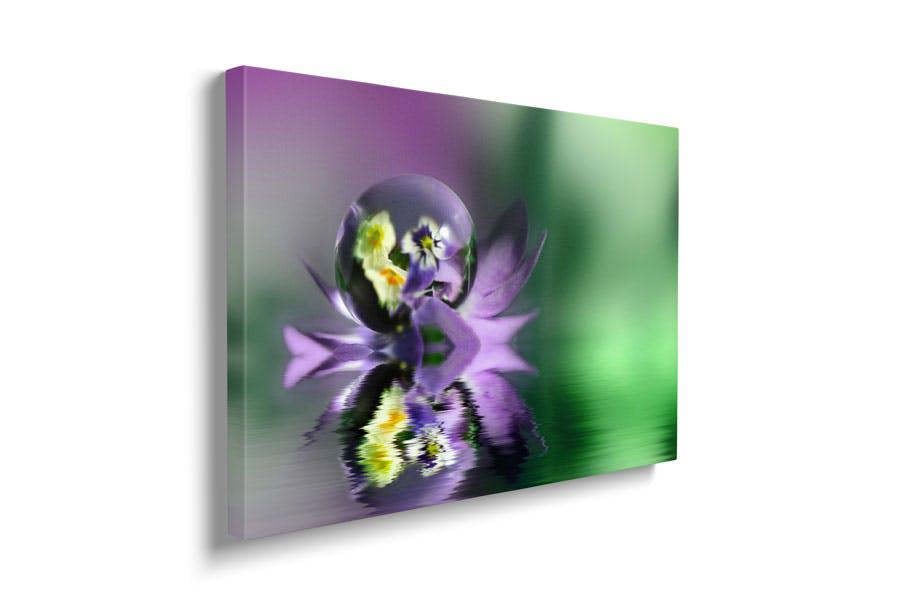 A solitary water droplet delicately rests upon soft purple petals, floating effortlessly on the still water's surface. Within the droplet, reflections of surrounding flowers bend and shift, creating a mesmerising, almost surreal effect. The interplay of light, colour, and texture gives this artwork a dreamlike quality, making it an exquisite addition to any interior.