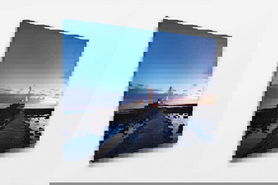 This striking photographic print beautifully captures the first light of day as the sun's rays gently illuminate the lighthouse, casting a warm glow against the deep blue tones of the sky. The low tide reveals an intricate landscape of rocky outcrops and reflective pools, adding depth and texture to this captivating scene. A perfect choice for lovers of coastal landscapes, nautical décor, or anyone seeking a tranquil yet dramatic centrepiece for their space.