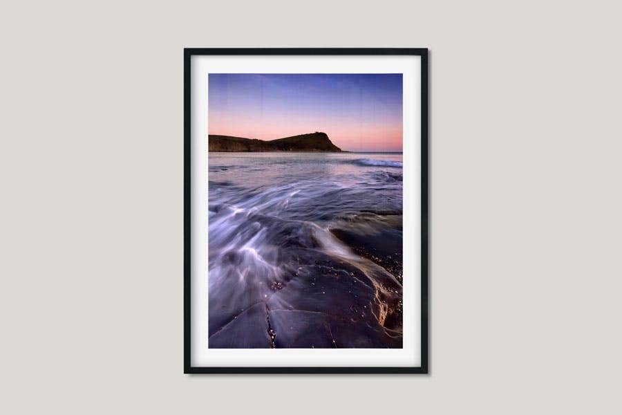 Immerse yourself in the natural beauty of Kimmeridge Bay, a breathtaking stretch of the Jurassic Coast. This captivating seascape showcases the rhythmic dance of the waves as they flow over the smooth, time-worn rocks, illuminated by the soft hues of twilight. The tranquil waters contrast beautifully with the rugged coastline, creating a scene that is both powerful and serene.