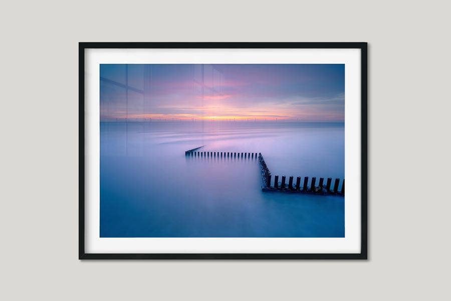 Perfect for lovers of minimalist seascapes and meditative wall art, this print brings a peaceful energy to any interior. The smooth water, geometric groyne, and distant wind turbines blend into a harmonious composition that evokes both stillness and movement, making it an ideal centrepiece for modern and coastal-inspired interior décor.