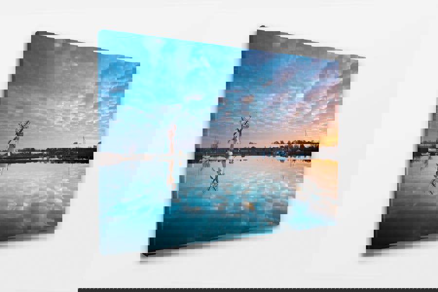 Wonderful colours and reflections bring this photographic print to life as Thurne Mill is seen reflected in the water on a calm winters morning. A glorious sky dawns across the Norfolk Broads landscape and brings beautiful reflections to the scene.