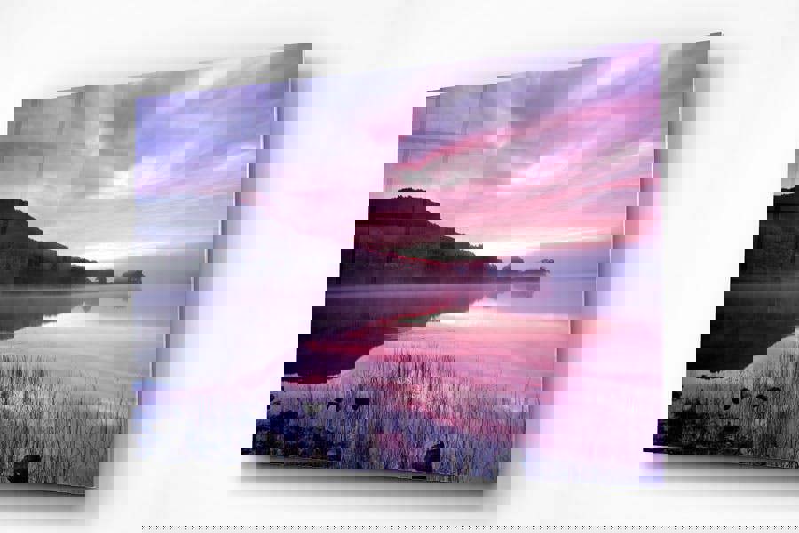 As the first light of day emerges, the sky is ignited with soft pinks and purples, reflecting beautifully across the still waters of Loch Achray. This breathtaking fine art print captures the serene atmosphere of the Scottish Highlands, where mist drifts gently over the landscape, and nature awakens in quiet harmony.
