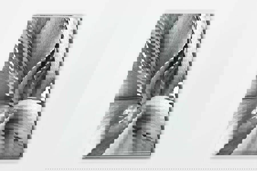 This striking monochrome floral print captures the intricate textures and flowing curves of tulip leaves in exquisite detail. The interplay of light and shadow enhances the organic movement of the petals, creating a sense of depth and elegance. The high-contrast tones and delicate structure give this botanical artwork a contemporary, almost abstract feel, making it a statement piece for any interior.