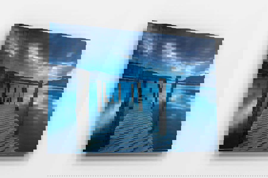 As twilight descends over Derwent Water, the landscape is bathed in a serene blue light, creating an atmosphere of pure tranquility. This stunning fine art print captures the stillness of the lake, where a weathered wooden pier stretches into the glass-like water, inviting you to step into the peaceful embrace of England’s beloved Lake District. The long exposure technique enhances the movement of the sky, softening the drifting clouds while the water remains perfectly calm.
