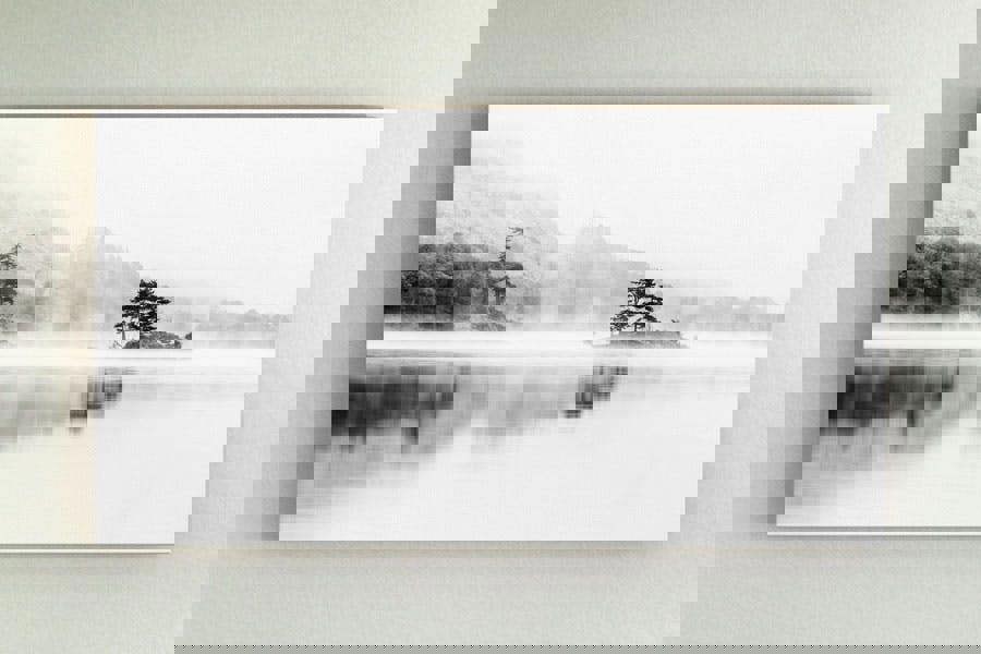 Capture the calm of a Lake District morning with 'Ullswater Dawn', a striking panoramic canvas print that evokes serenity, stillness and solitude. This minimalist black and white photograph shows Wall Holm Island emerging gently from the mist that hangs low over Ullswater’s tranquil waters at daybreak. The trees stand silhouetted against the swirling fog, their reflections mirrored perfectly on the loch's surface in a beautifully still moment of autumnal peace.