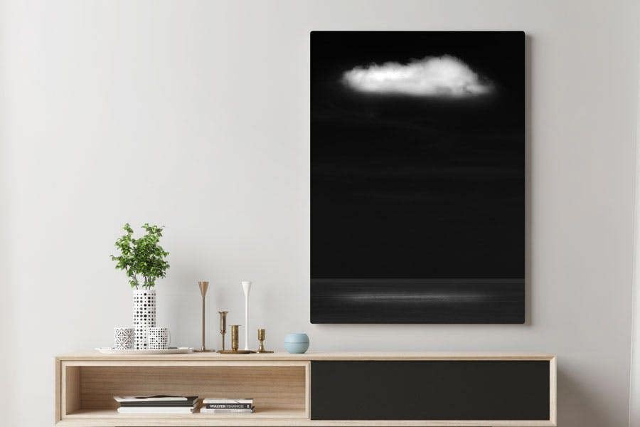 Step into the natural beauty of Wanderer, a minimalist black and white print by acclaimed photographer Doug Chinnery. This striking artwork captures a lone cloud drifting above a dark, tranquil seascape, evoking a profound sense of solitude and reflection. The interplay between the luminous cloud and the dark, minimalist background creates a hauntingly beautiful composition that is as thought-provoking as it is visually stunning.