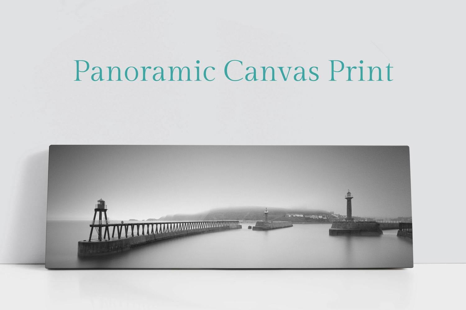 Whitby in the Mist is available exclusively as a panoramic canvas print. The photograph is produced as a 12-colour giclée print, ensuring smooth gradation across the misty sky and subtle detail in the harbour structures. The canvas is stretched over a 38mm deep kiln-dried, knotless pine frame with finger joints to maintain long-term stability and prevent warping. Each canvas is hand-finished by a professional print team and arrives ready to hang. Need a different sized panoramic canvas? Contact us for a custom order.