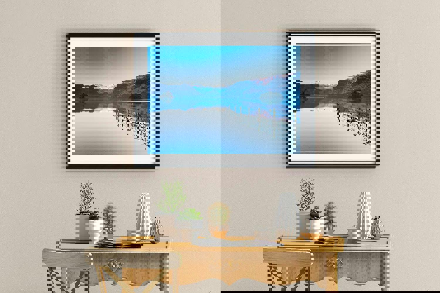 This Lake District print is well suited to interiors that benefit from a sense of visual quiet and depth. It works particularly well in living rooms, bedrooms, studies, or hallways where cooler tones complement neutral palettes, natural textures, or pared-back furnishings. The strong horizontal composition and reflective surface make it effective on wider wall spaces, allowing the image to sit comfortably without visual noise. In professional environments such as offices or reception areas, it offers a composed presence that supports focus rather than distraction.