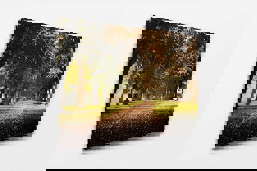 A beautiful autumnal landscape print showing an avenue of majestic trees following a quiet path that meanders into the hazy distance. Fallen leaves scatter the path and help create a lovely woodland scene with a nice blend of green and brown colours. Step into the tranquil beauty of nature with the "Woodland Path" fine-art print. This enchanting piece captures the serene atmosphere of a tree-lined path, where sunlight filters through the canopy, casting a warm, golden glow on the forest floor. The rich, earthy tones and lush greenery create a sense of peace and solitude, inviting you to take a moment to breathe and escape into this idyllic woodland scene.