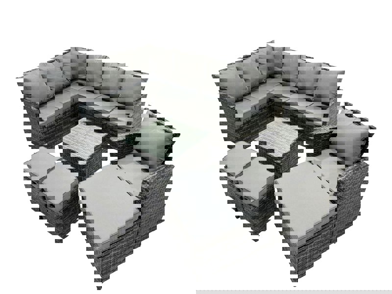 Finished in dark grey mixed rattan with dark grey fabric, the set includes a fire pit dining table and a combination of sofas, stools and a chair. Cushions are supplied for comfort, with removable covers to help keep your seating feeling fresh.
