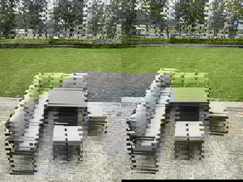 Designed for relaxed outdoor dining and sociable lounging, this L-shaped garden furniture set brings flexibility to patios, gardens and balconies. The modular layout combines sofa seating, stools and an adjustable dining table, making it easy to switch between coffee-time comfort and dining-height practicality.