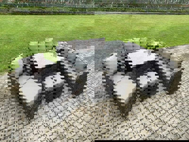With an oblong rectangular dining table, 3-seater sofas and adjustable reclining chairs, this set is arranged for relaxed dining and everyday lounging. Thick seat cushions and an ergonomic high-back design add comfort, while tempered glass table tops provide a practical surface for serving and entertaining.